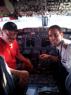 in the cockpit of a Delta Airlines jet with his son Paul Jr.
