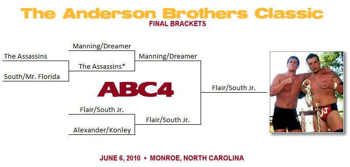 Family affair: The ABC4 featured two family connections. The father-and-son team of George South Sr. & Jr. were reigning Anderson Brothers Classic tournament champions from ABC3, but chose to take different partners for ABC4. In the history of the tournament, there have been three father and son combinations, the Souths (ABC2 and ABC3), Bobby and Dillon Eaton (ABC3), and Bob and Brad Armstrong (ABC1). But the most significant family connection was that of George South Jr.'s tournament partner Reid Flair - he is Anderson family. Reid Flair's father, legendary 16 time world champion "Nature Boy" Ric Flair, is a cousin of the Anderson Brothers. It is the second time a member of the Anderson family (albeit, extended family) has won the ABC trophy: Brad Anderson won with George South Sr. at ABC1, and now Brad's cousin Reid has won with George South Jr. at ABC4. Previous Champs: Only two ABC4 participants were former ABC champions: George South Sr. won with Brad Anderson at ABC1; South Sr. and Jr. won at ABC3. Title Time: This is the second time the EWA Jr. Heavyweight championship has changed hands at the Anderson Brothers Classic. Jake Manning defeated tournament partner Charlie Dreamer to win the gold this year at ABC4. At ABC2, "Asian Sensation" Mike Lee won the EWA Jr. Heavyweight title in a special battle royal. The EWA Heavyweight championship has only been defended at one tournament event, ABC2, where then EWA Champion Masked Superstar (Bill Eadie) defeated George South Jr. Tribute: The Masked Assassin used the "Anderson Slam" (hammerlock slam) on Cederick Alexander during the tournament, paying tribute to the Anderson Brothers who made the move famous. In another tribute, Jake Manning paid homage to one of Gene and Ole Anderson's fiercest rivals in the 1970s, Paul Jones, using the airplane spin and winning the EWA Jr. Heavyweight title with the Indian deathlock. Secret Identities: There were three masked wrestlers in the tournament - Mr. Florida, Assassin #1, and Assassin #2. The NWA ruling that a masked wrestler winning the tournament would have to unmask or forfeit the championship (known as the "Midnight Rider Rule" first enforced by NWA President Eddie Graham in the late 1970s) is expected to be challenged in court. Headed South? Mr. #1 George South has had a rough month. On 5/8 in Lexington NC, he lost the EWA Heavyweight title to Jake "The Snake" Roberts, and now less than one month later, the man who had held a share of the Anderson Brothers Classic championship on two previous occasions, failed to make it to the final four. On the other hand, South's son is on a roll, returning to the EWA to win a share of the Anderson Brothers Classic championship for the 2nd year in a row. Anderson: Edie Anderson (wife of the late Gene Anderson) made her second appearance at an ABC event, having also been a part of the inaugural event (ABC1) in Shelby NC in December 2004. Brad Anderson, Gene's son, made his third appearance, having won the tournament with George South at ABC1 and served as a special referee in the finals of ABC3. He served as a special official for Anderson memorabilia to kick off the festivities at ABC4. Dirty Laundry: This marked the fourth ABC tournament where George South wore his Anderson Brothers t-shirt that has not been washed since the shirt was presented to him before ABC1. This streak must end!
