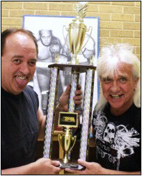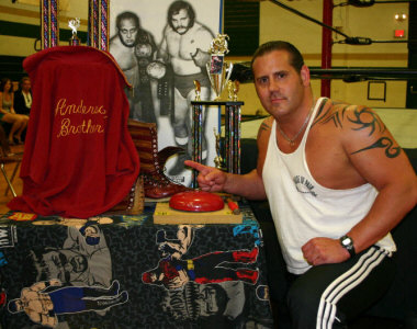 Brad Anderson (son of the legendary Gene Anderson) at the Anderson Brothers Classic Trophy Table at ABC 3 Charlotte. On the table are both the current and retired trophies, a poster print of Gene & Ole Anderson, the official ring bell, and the late Gene Anderson's ring jacket and trademark Anderson maroon-and-gold striped boots.