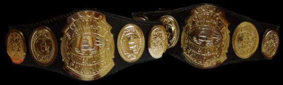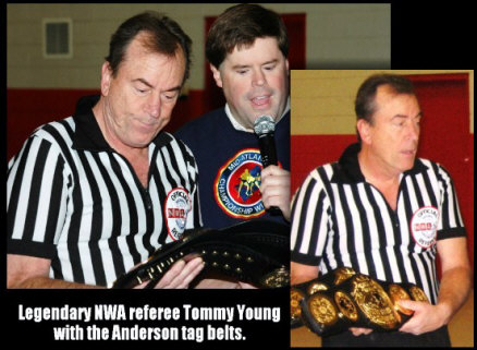 Legendary NWA referee Tommy Young inspects and presents replicas of the NWA world tag team title belts that Gene and Ole Anderson wore in the 1970s. They will be presented to future Anderson Brothers Classic tournament winners along with the ABC trophy.
