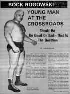 "After that, Gagne and several of the other wrestlers showed me what I was doing wrong. I soon learned why Gagne was the world champion. He is a virtual encyclopedia of wrestling knowledge." This is just a few of the things that Alan Rogowski had to say about his early career. In high school, Rogowski had gained fame as a football star. He earned the nickname "The Rock" because his opponents found that it was impossible to move him out of the way on a play over on his side of the line. When he entered the professional ring, the nickname stuck. He soon became as well known as "The Rock" as he was by his real name. It was in Omaha, Nebraska where he really became a star. Promoter Joe Dusek tells it this way, "I gave the guy a chance to wrestle more or less as a favor to his uncle. Dick the Bruiser had drawn some great crowds for me in Omaha and I felt that I should at least give The Rock a chance to show his wares. Was I surprised! When I saw The Rock handle such veterans as Iron Mike DiBiase, Harley Race, Bob Orton and Mitsu Arakawa, I realized that I wasn't doing anyone but myself a favor by having The Rock on my cards. In no time he had won the Midwest Heavyweight Championship and was headlining all the cards in a four-state area. Whenever I see a young man like The Rock enter wrestling, it makes me feel good. Mind you, he is not in the same class as Ernie Dusek was in his prime, but he would defeat most of the wrestlers the Riot Squad used to face." So it was that Alan Rogowski learned his lessons well and a few months after turning professional, he was one of the top stars in the Midwest. Now he is faced with the big decision. "What style of wrestling is the best for me?" is the question he has been asking himself over and over for the past few months. "I know that there is a natural tendency to copy the Bruiser. As my uncle, he has a great influence on me. However, I don't want to be a copy of anyone. After all, as long as there is wrestling, there will be only one "Bruiser" and any imitation will be just that. I'm not trying to make a career out of being Dick the Bruiser's nephew. I want to be known for my own style. So far I haven't wrestled as rough and rugged as Bruiser and Crusher do, but sometimes being easy on an opponent has cost me, and in this business, the more you win, the more money you make." "I know there are some wrestlers who make it mainly on skill. Gagne, Hodge and Sharkey are some of the best scientific wrestlers around, but if you watch them in action, you will soon realize that they can dish out the rough stuff as fast as anyone else." "I have come to the conclusion that the difference between a scientific wrestler and a rough style wrestler is more or less in the mind of wrestling fans. Actually, in professional wrestling, everyone is rough. Some may occasionally wrestle a clean match, but if one man wants to resort to illegal tactics, I don't know of a single wrestler who isn't ready to fight fire with fire." "After six months of wrestling, I've decided that the Bruiser's style is not exactly my style. Neither is Gagne's. I've seen too many wrestlers who never reach the top because they are too busy trying to copy the style of some great champion. The style may work for the champion, but in almost all cases, it doesn't work for the pupil because he has a different body and a different personality" "I have one goal in professional wrestling and that is to win the world's heavyweight championship. To get to the top, I feel that I have to develop my own individual style. When people go to a wrestling match, I want them to talk about 'The Rock' and his style of wrestling." "Let's take the current champion – Verne Gagne – for example. He has speed, agility and experience. Twenty years of professional wrestling has molded him into a machine. He is small, but he can run circles around larger wrestlers. The drop kicks and the flying head scissors are his pet weapons."