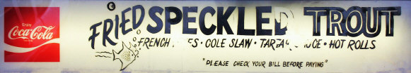 under a covered walkway touting Fried Speckled Trout, Delicious